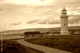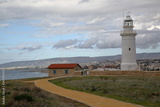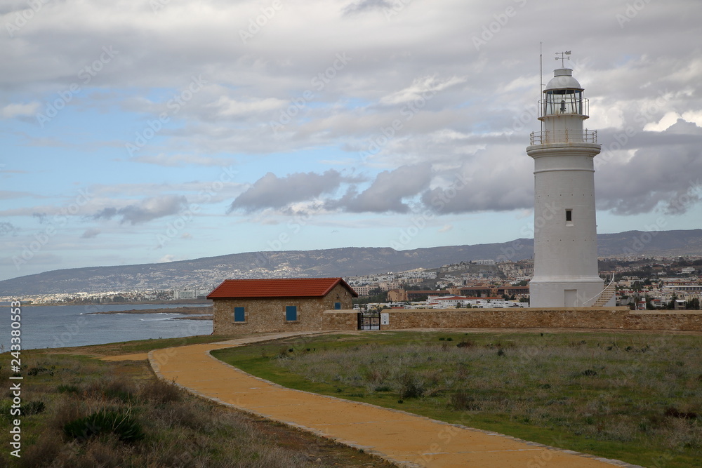 landscape with white lighthouse and traditional stone house next to on seaside in pafos, Cyprus, in background hills, city, cloudy sky, sandy path leading to lighthouse