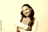 A young girl is a student of a high school student with a stack of textbooks in her hands. on white background