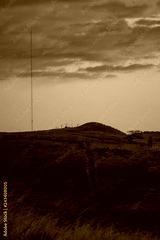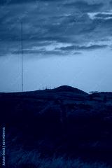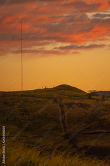 Vertical de un atardecer con colores muy cálidos con una torre de señal celuar
