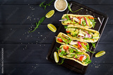 Mexican tacos with chicken meat, avocado, tomato, cucumber and red onion. Healthy tortilla. Wrap food. Taco. Top view