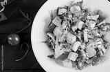 Healthy grilled chicken Caesar salad with tomatoes, cheese and croutons. North American cuisine. Top view