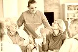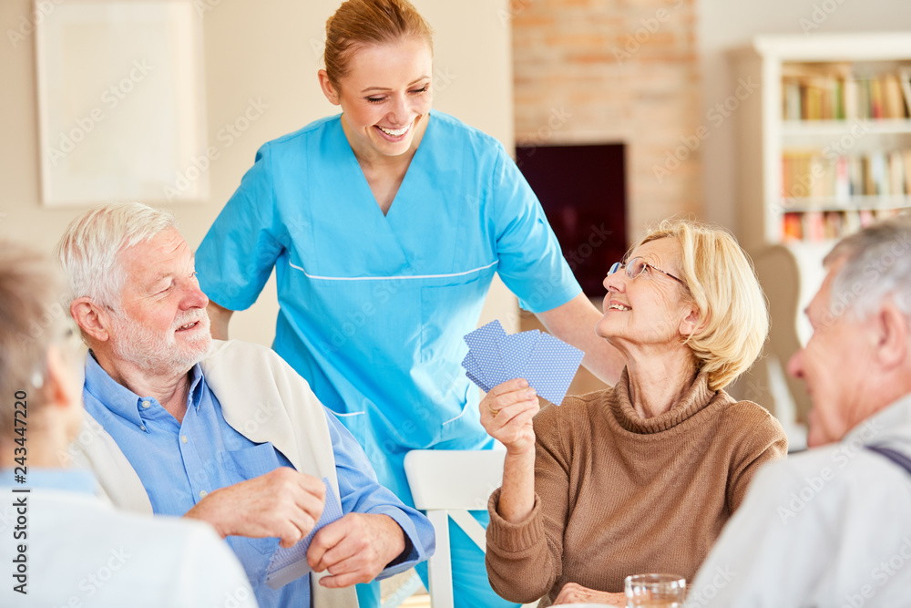 Lächelnde Pflegekraft schaut zu beim Kartenspiel