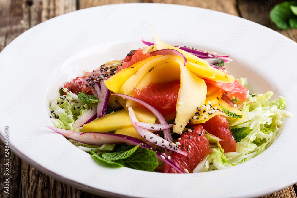 Healthy plant-based meal, salad with mango, grapefruit and cabbage