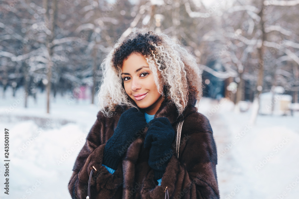 Outdoor close up portrait of young beautiful fashionable woman with afro hair , wearing fur coat in winter park. Winter fashion, Christmas holidays concept.