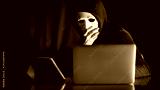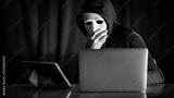 Mystery male hoodie hacker holding white mask looking at laptop computer. Anonymous social masking. Ransomware cyber attack or internet security concepts