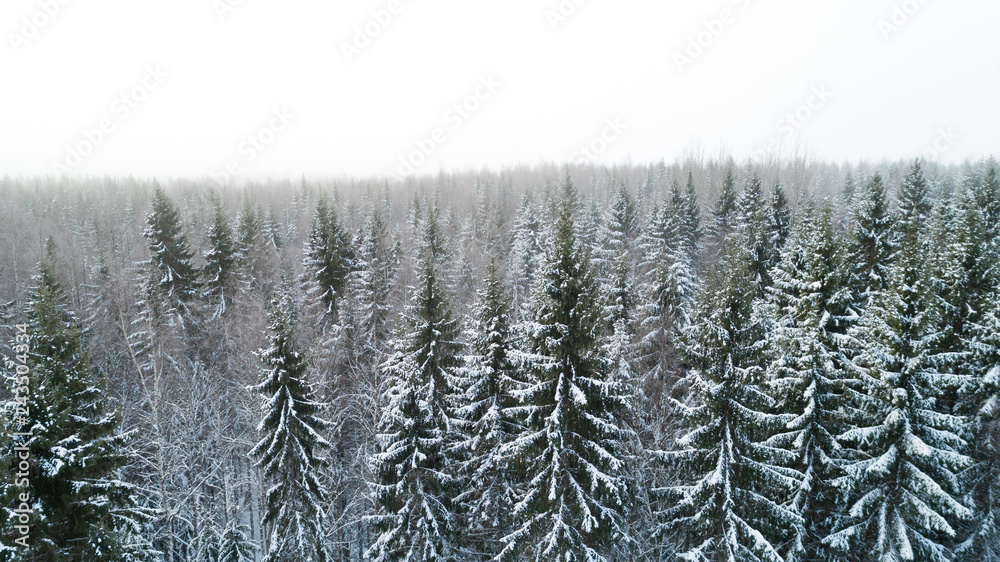 Aerial view of beautiful frozen fir trees. Misty morning.
