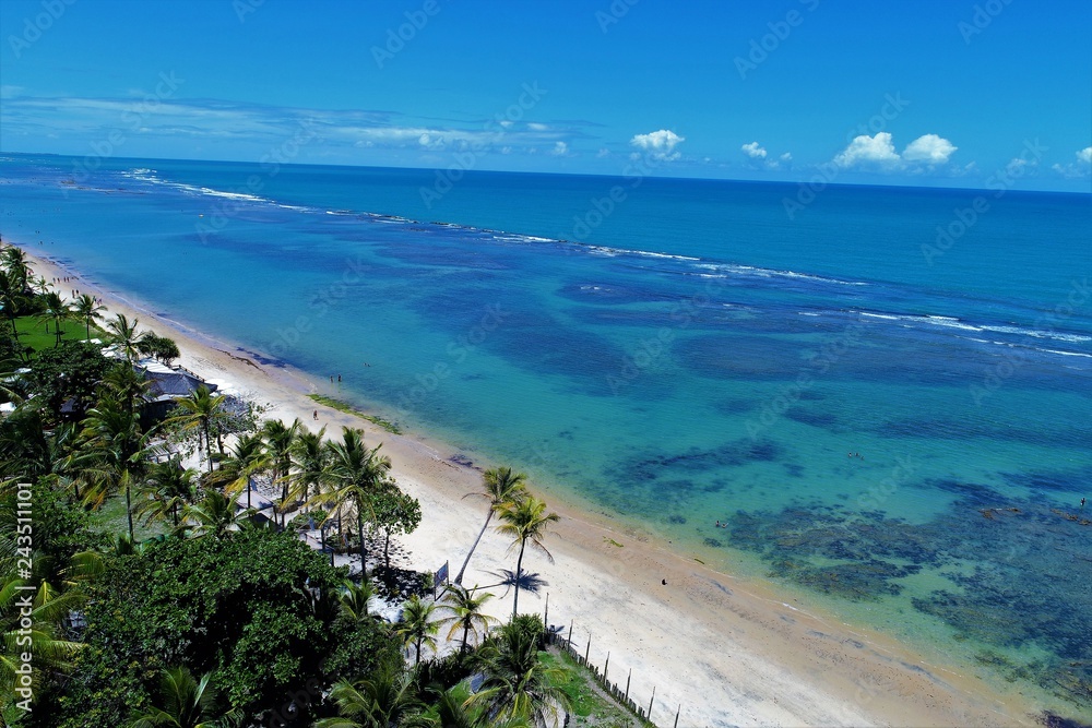 Aerial view of a paradise sea with clear water. Fantastic landscape. Great beach view. Arraia d’Ajuda, Bahia, Brazil