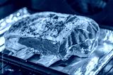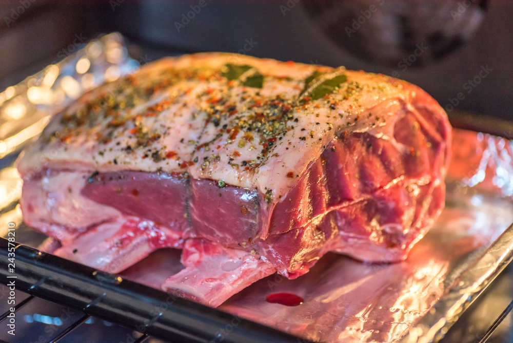 closeup view raw beef cross rib chunk on oven tray with foil inside oven