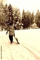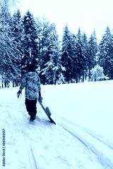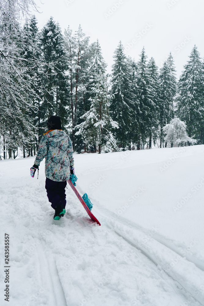 Snowboarder woman waking on the mountain forest with snowboard in hands. Back view