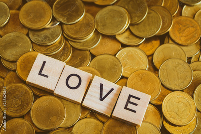 Love word on wooden blocks on gold coin money ,Valentine day concept.