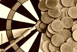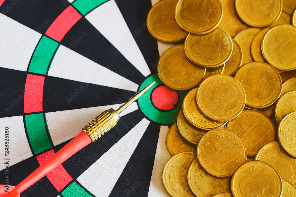 Red arrow dart board on Gold coin money for business success concept.