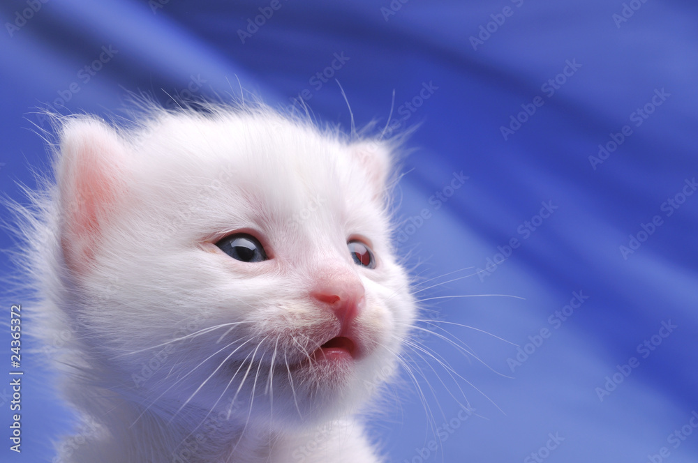 Portrait of a beautiful white kitten on blue background.