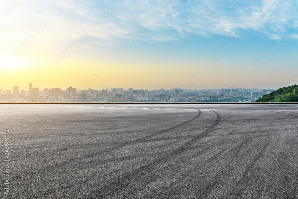 Panoramic city skyline and buildings with empty asphalt road at sunrise