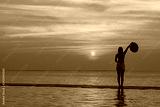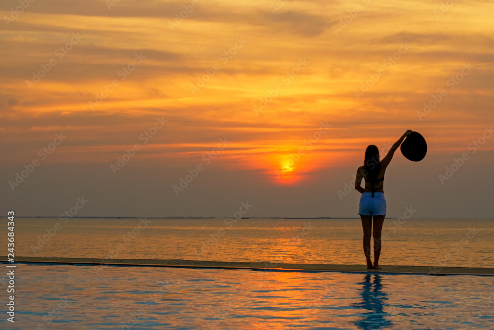 Lifestyle woman happy in big hat relaxing and freedom on the swimming pool near the sea and beach in the sunset, vacations and Holiday tips. Summer and Travel Concept