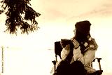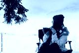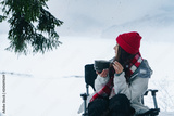 Beautiful woman sitting near fire with a cup of tea in the winter forest with scenic mountain view. Tourist camp with campfire. Camping and hiking, winter adventure, nature landscape. Side view