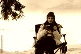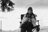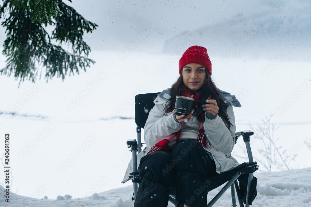 Portrait of beautiful woman sitting near fire with a cup of tea in the winter forest with scenic mountain view. Tourist camp with campfire. Camping and hiking, winter adventure.
