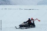 Man and woman riding on a snowmobile on the frozen lake in the mountains