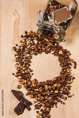Homemade granola in glass jar on wooden table