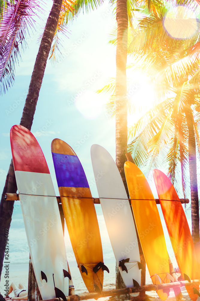 Many surfboards beside coconut trees at summer beach with sun light and blue sky background.