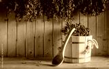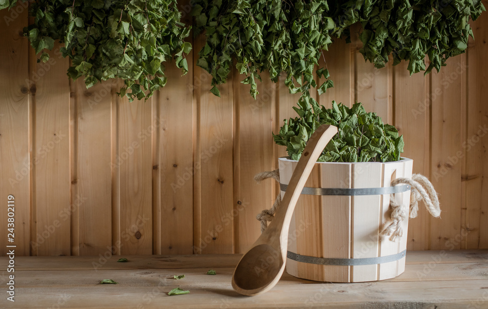 A wooden bucket and a birch broom in a Russian bath. Sauna.