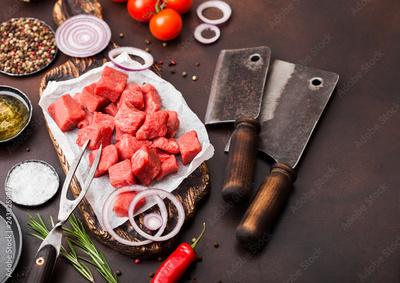 Raw lean diced casserole beef pork steak on chopping board with vintage meat hatchets on brown background. Salt and pepper with rosemary and red onion and garlic.Space for text