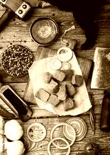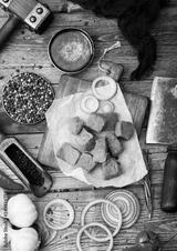 Raw lean diced casserole beef pork steak on chopping board with vintage meat hatchet on wooden background. Salt and pepper with fresh rosemary.
