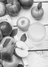 Glass of fresh organic apple juice with red and green apples in vintage box on wooden background