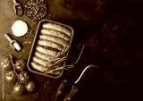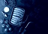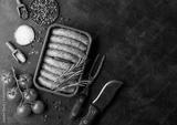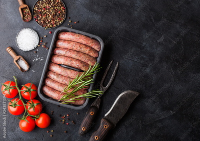 Raw beef and pork sausage in plastic tray with vintage knife and fork on black background.Salt and pepper with tomatoes and rosemary.Space for text
