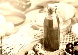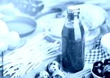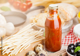 Homemade spaghetti pasta with quail eggs with bottle of tomato sauce and cheese on wooden background. Classic italian village food. Garlic, black and green olives, oil and bread. Frying pan