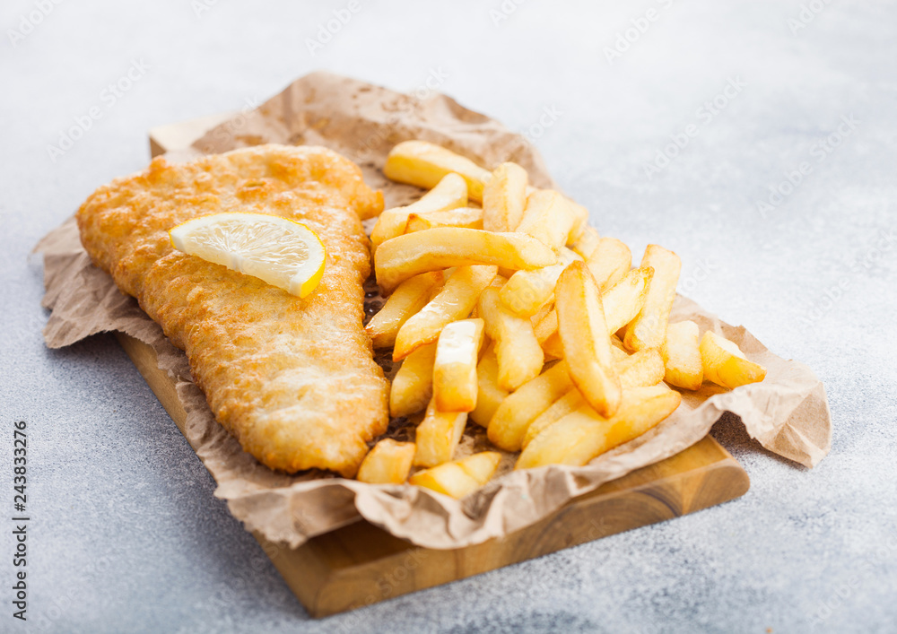 Traditional British Fish and Chips with lemon slice on chopping board on white stone table background.