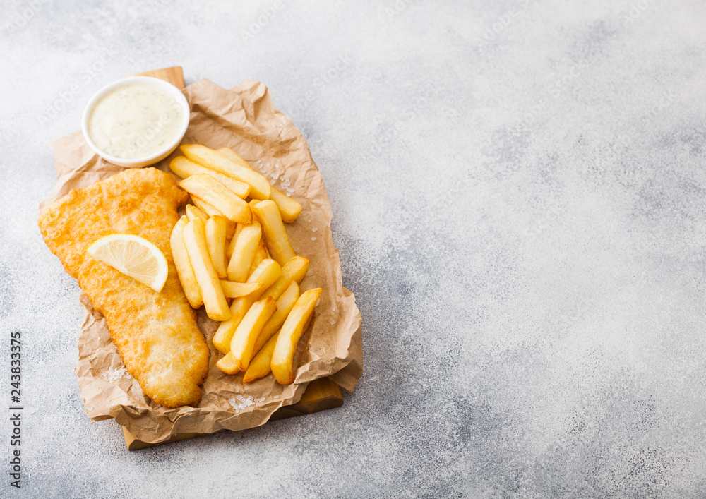 Traditional British Fish and Chips with tartar sauce on chopping board and lemon slice on white stone table background. Space for text