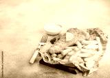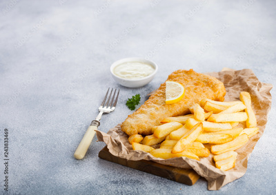 Traditional British Fish and Chips with tartar sauce on chopping board with fork and green peas on white stone table background. Space for text