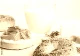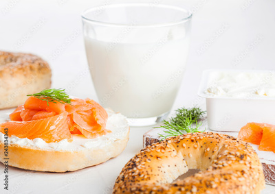Fresh healthy bagel sandwich with salmon, ricotta and glass of milk on light kitchen table background. Healthy diet food.