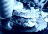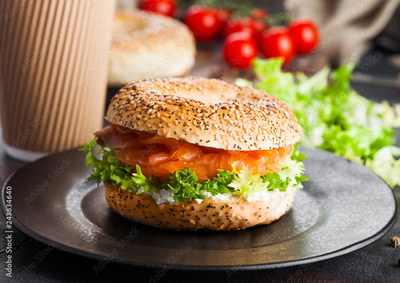 Fresh healthy bagel sandwich with salmon, ricotta and lettuce on black plate on black kitchen table background. Healthy diet food. Paper cup of coffee and fresh vegetables
