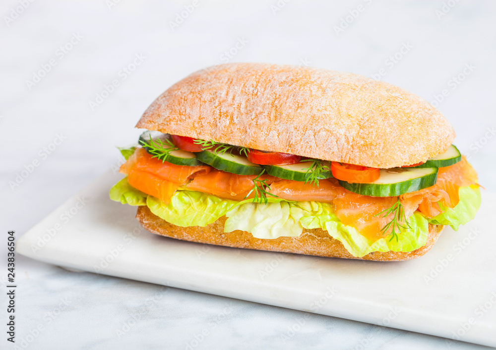 Fresh healthy salmon sandwich with lettuce and cucumber on marble board on white stone background. Breakfast snack. Diet food