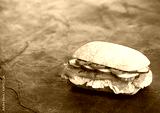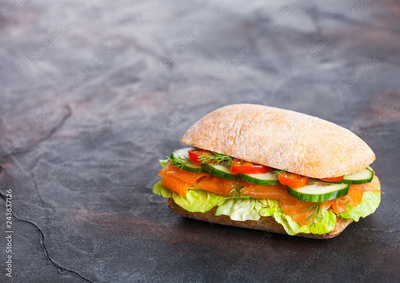 Fresh healthy salmon sandwich with lettuce and cucumber on black stone background. Breakfast snack. Space for text