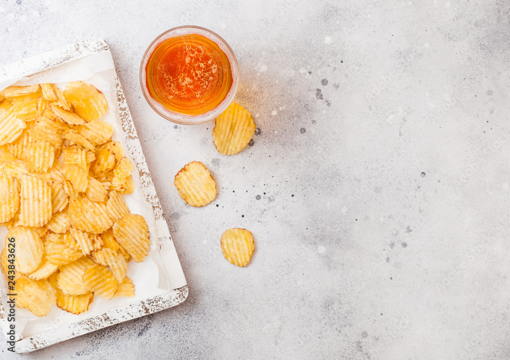 Glass of craft lager beer with potato crisps snack in vintage wooden box and opener on stone kitchen table background. Beer and snack. Space for text. Top view