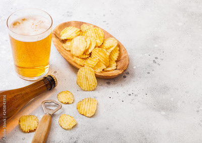 Glass and bottle of craft lager beer with potato crisps snack and opener on stone kitchen table background. Beer and snack. Space for text