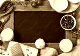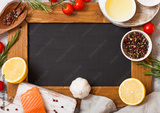 Blank chalkboard for text. With raw seafood salmon and vegetables and spices on stone kitchen background
