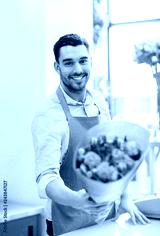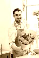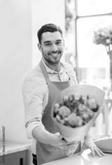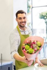 small business, sale and floristry concept - happy smiling florist with bunch at flower shop