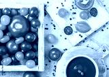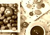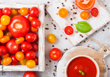 Glass of fresh organic tomato paste with fresh raw tomatoes basil and pepper in box on stone kitchen background