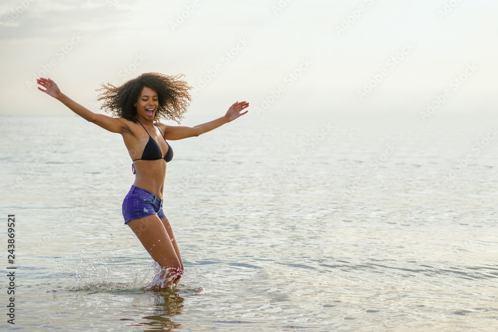 afro hair girl jumping in the sea on beach vacation. concept of woman freedom happy single.