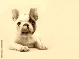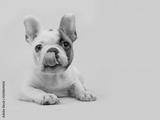 Cute french bulldog puppy lying down on a pink background licking its nose