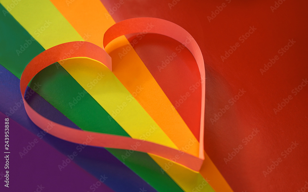 LGBT concept. Pink paper heart on the sheets in colors of the flag of sexual minorities background as card for Valentine's Day. Lgbt flag rainbow background. Copy space. Horizontal