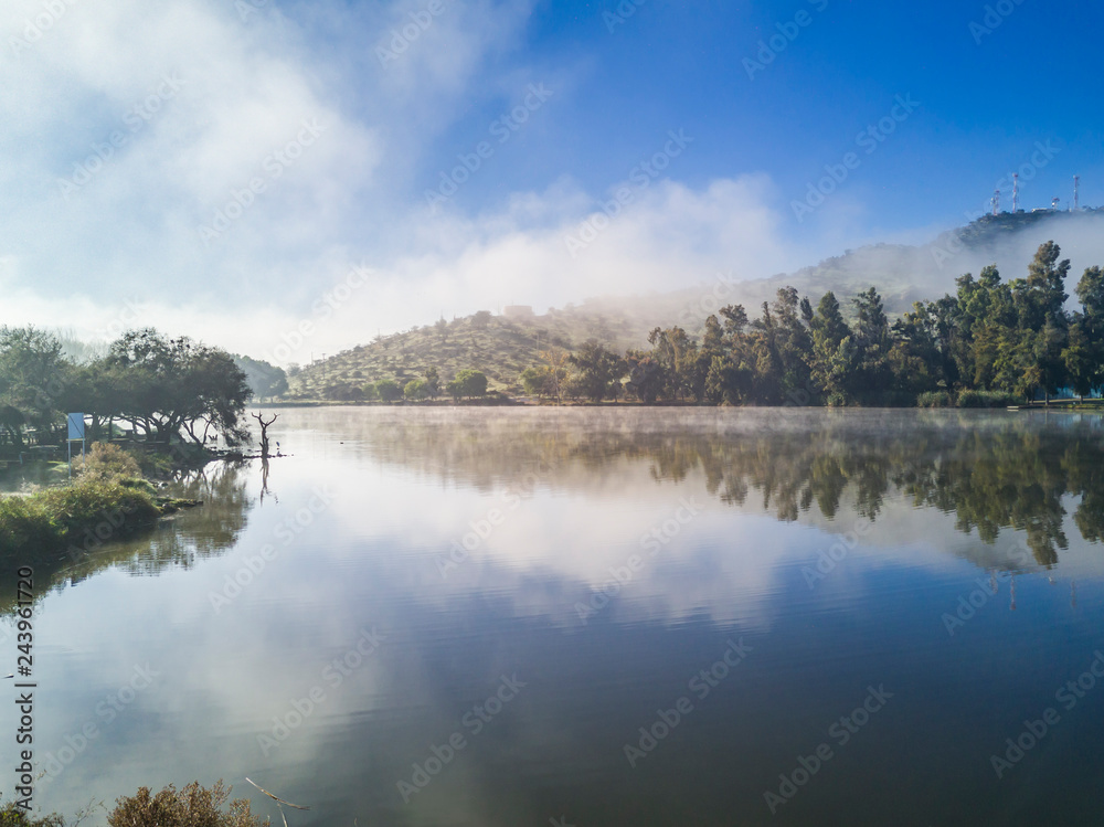 An idyllic landscape, Caren Lagoon during Winter Season, a colorful mirror over the waters with amazing cloud reflections with the trees foliage in the forest on a misty day with a moody atmosphere
