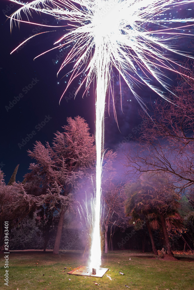 An amazing fireworks show during New Year's Eve celebration for the beginning of a happy new year on a nice Christmas in Spain at Madrid city