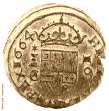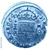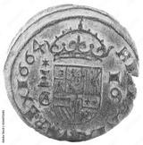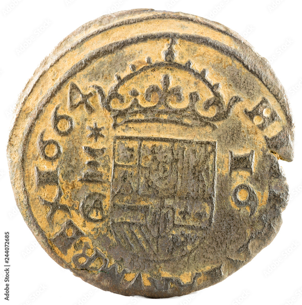 Ancient Spanish copper coin of King Felipe IV. 1664. Coined in Cuenca. 16 Maravedis. Reverse.