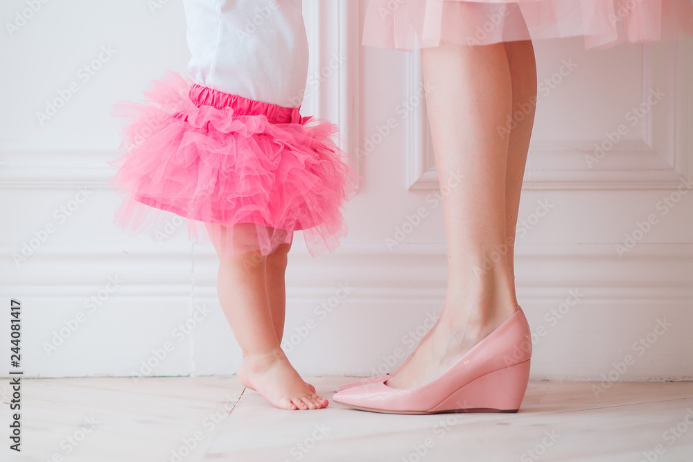 Mother's legs and daughters in pink skirts. My daughter is trying to put her legs to her mother. Legs girls and women. mother holds daughter in her arms