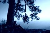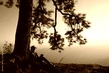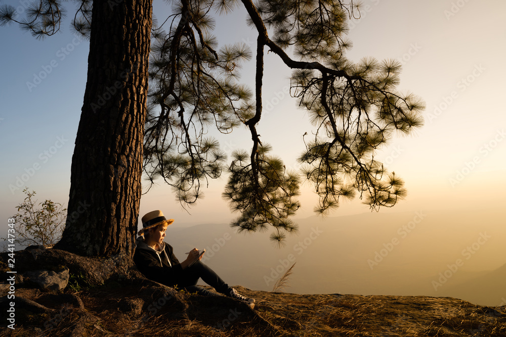 Woman sitting under pine tree reading and writing looking out at beautiful natural view