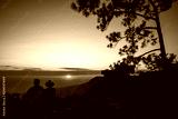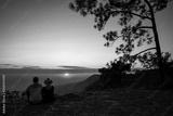 Image of sunset or sunrise on orange and yellow horizon with a silhouette of a couple in natural surrounding